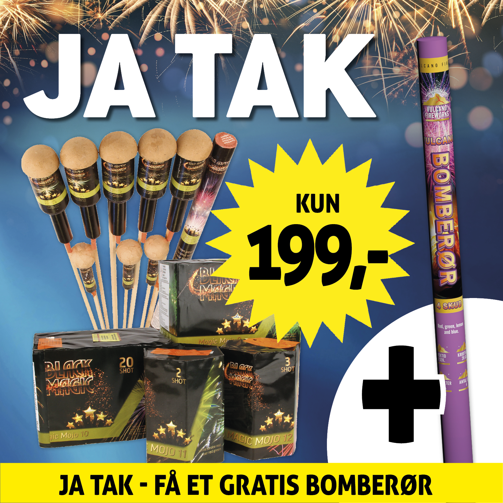🔥 JA TAK – FYRVÆRKERI 🔥 MOJO sortiment 💥 KUN 199,- 💥 👉🏼Afhentning senest søndag 21. december 👉🏼Sælges og udleveres ikke til personer under 18 år Kig forbi og se det store udvalg af fyrværkeri til knaldgode priser